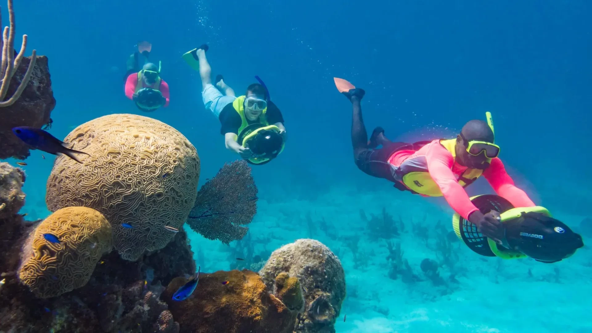 You will discover the underwater world with sea scooters! Our underwater scooters are battery powered and designed to do all the work for you. Explore the wonders of the oceans brilliant colors and incredible marine life all at the push of a button on our scooter. See diverse marine life and colorful coral while being propelled via sea scooter through waters surrounding the reef. we take snorkeling to the next level! Yup with these beauties, James Bond and Jacques Cousteau have nothing on you!